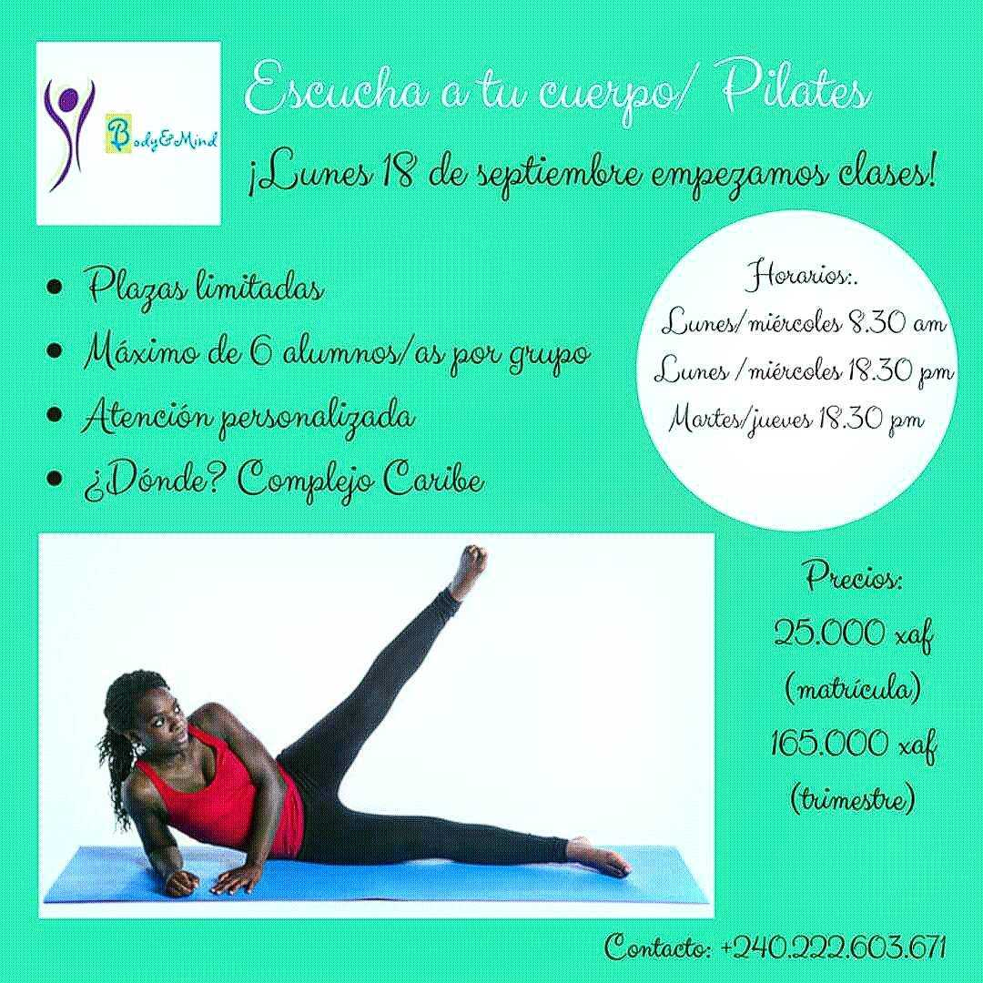 Aprende a conocer y a escuchar tu cuerpo en Body&Mind: Pilates, Yoguipilates (para niñ@s), Quiromasaje, Deportivo/Runners, Vendajes, Ventosas, Masaje Linfático, Reflexología Podal, Strech, Auriculoterapia, etc. Seguimos en Complejo Caribe (Malabo). Contacto: +240.222.603.671