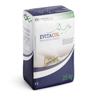 Evitacol Porcelánico Blanco C1TE le confieren una reología adecuada, así como un deslizamiento reducido dado por la acción de los copolímeros que lleva incorporados. Se presenta en sacos de papel con lámina de plástico antihumedad de 25 kg expedidos sobre palets retractilados de 1.600 kg (64 sacos).